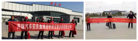 今年春节来临之际,面对庞大的务工人员返乡潮,开瑞汽车第一时间组织各地经销商在当地开设开瑞专线,驻点各大火车站、汽车客运站等,提供茶水、零食等,并免费接送回乡人员返回家中过年。面对春运交通压力大,以及全国部分地区受到冰雪天气的寒潮影响的情况下,开瑞专线的设立无异于雪中送炭般温暖。
