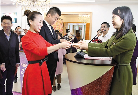执子之手,与子偕老,每逢情人节就成了不少新人领证的“佳期”。记者了解到,2月14日早上8点不到,东莞市婚姻登记管理中心(以下简称“中心”)大厅里就已站满了不少前来登记领证的新人。上午9点半,有8对新人得到了东莞市民政局副局长杜江的亲自颁证与祝福。记者了解到,特邀一些领导及社会知名人士为新人颁证是该中心推行的一项特色颁证服务,此外,只要提前预约,还能提供证婚服务,增加新人互换信物、感恩父母、全家合影等环节。