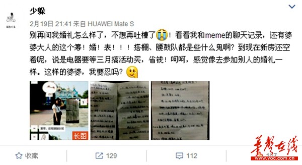 华声在线2月21日讯(记者 龙腾)近日,网友李小姐有一些甜蜜的小烦恼,为了3月底的婚礼,婆婆从年初就开始筹备了,还详细列出筹婚清单,但她似乎并不满意,在微博吐槽“感觉像去参加别人的婚礼一样!”引发网友热议,一时间“中国式婆婆筹婚”成了微博热门话题。