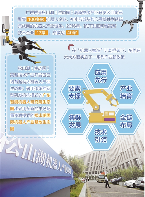 在需求侧方面,东莞以创新政策推动“机器换人”,扩大机器人应用示范市场,加快“东莞制造”的智能化改造。在供给侧方面,东莞大力引进机器人智能装备企业,突破机器人产业核心和关键技术,加快培育发展机器人产业。