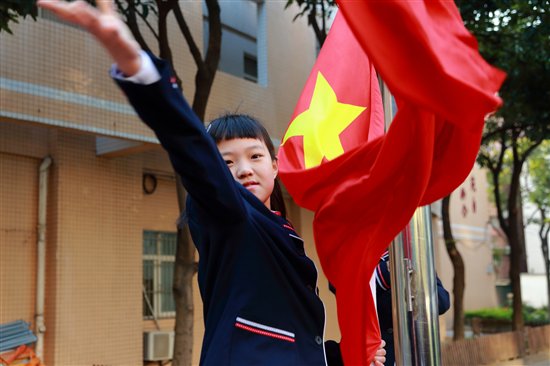 “升国旗,唱国歌”,随着雄壮的义勇军进行曲响起,升旗手振臂一挥,国旗徐徐展开,歌声在校园里回荡。在全校师生的注目礼中,鲜艳的五星红旗在新学期第一缕阳光的照耀下、伴着全校师生新的期望和向往冉冉升起,迎风飘扬在中大附属外国语实验小学的上空。