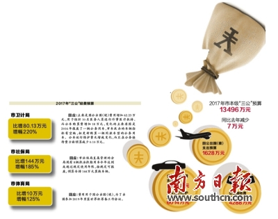根据报告,2017年市本级“三公”经费预算为13496万元,同比去年减少7万元。具体包括:因公出国(境)支出1628万元、公务用车购置支出1566万元、公车运行维护支出6014万元、公务接待费支出4288万元。