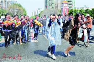 尽管年轻人是射水狂欢的主力军,但不少小孩也乐在其中,并展现出甚为温情的一幕。一对身披黄色雨衣的母子在人群中“冲锋陷阵”,妈妈在前面持枪开路,一脸憨实、体型微胖的爸爸则提着黄色水壶亦步亦趋,随时为小女儿提供“补给”,由于未穿雨衣全身上下湿透,但却始终一副无所畏惧、无怨无悔的样子,场面温馨感人。(记者 马骏)(来源:广州日报)