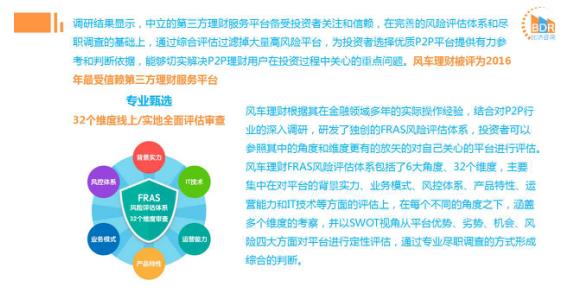 根据调研结果和对受访人群的统计,投资者在进行P2P理财过程中对中立的第三方平台较为关注和依赖,主要原因是看重其在风险评估上的专业能力以及所提供第三方服务和功能。其中,风车理财凭借其自主研发的FRAS风险评估体系以及所提供的分散投资等相关服务,获得了“2016年度最受信赖第三方理财服务平台”奖项。