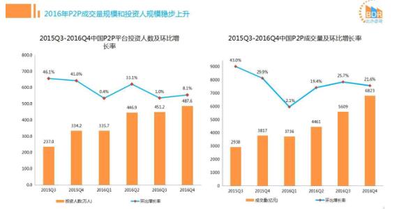 报告指出,受监管政策影响,2016年国内市场P2P平台数量増势减缓,而问题平台数量在不断上升,行业洗牌格局加剧,优胜劣汰趋势明显。与此同时,P2P理财的成交规模和投资人数却未受行业影响,两项指标均在稳步上升,表明P2P理财在大众投资者当中的认知程度和影响力正在不断扩大。数据显示,2016年第四季度中国P2P平台投资人数达487.6万人,环比增长率为8.1%。中国P2P成交量规模达6823亿元,环比增长率达21.6%。