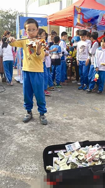 “好听!再来一首!”……除了有实物义卖,有班级还上演“空手套白狼”——卖才艺。记者在现场看到,一群高年级的学生街舞、拉丁舞、小提琴、独唱等节目轮番登场,精彩的表演博得观众阵阵喝彩,大家纷纷慷慨解囊,表示赞赏。不一会儿,5元、10元、100元不等的钞票堆满整个小提琴盒。