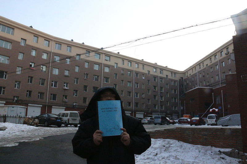 (腾庆玉站在已经入住的双阳区饲料公司综合家属楼一角,向记者展示《双阳区政府拖欠工程款、农民工及债权人明细》)