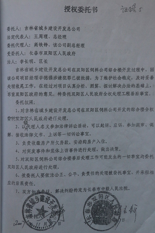 据腾庆玉介绍,2007年11月,开发公司李德强终因个人原因被判刑,此时的吉林省城乡建设开发公司又正在改制,经协调,双阳区人民政府接受了开发公司的全权委托处理工程善后事宜,并形成了《授权委托书》,至此,区政府完全承担了开发公司的角色。