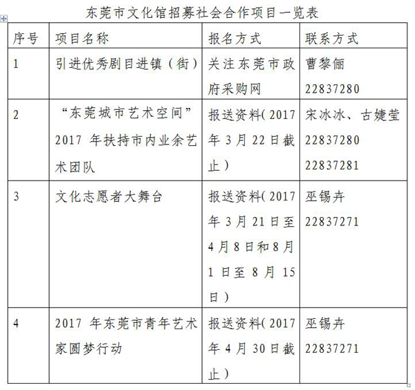 招募合作的项目详细方案和要求、报名表等资料可前往东莞市文化馆官网(www.dgswhg.com)下载或关注官方微信“东莞市文化馆”。