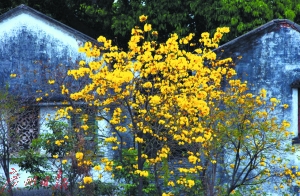 三月的水乡,黄花风铃木披上了明亮的黄色舞衣上场,轻舞飞扬。适逢近期阴雨绵绵,成片的黄花为这阴沉的天增添了一抹亮丽春色。