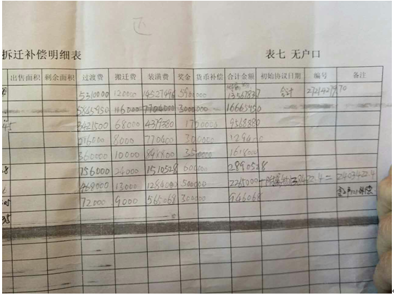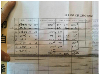 一份赵北峰社区拆迁明细表所记载的数据显示,该村应获得补偿的共322户,其中包括无手续的村民10户,无户口的村民1户。有村民质疑,赵北峰村村委会上报的总户数明显多于实际户数,有虚报以套取私分拆迁补偿的嫌疑。有村民则称,村主任王海彦主导虚报数字,以与其他村干部骗取私分补偿,骗取到的拆迁补偿款和安置房全部由这些村干部的亲属获得。