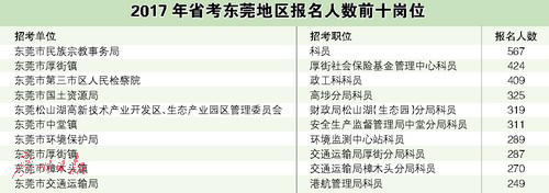 2017年广东公务员考试网上报名工作已经截止。记者昨日获悉,东莞地区294个职位有人报考,招录435人,成功报名人数16767人,其报招比为38.54,居全省第二,仅次于佛山。