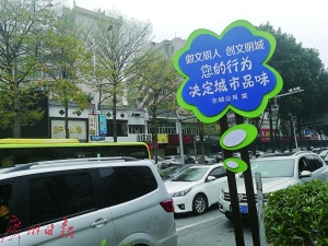 昨日上午,记者在黄旗山城市公园前的红绿灯处看到那个蓝色的牌子,它立在绿化带里,两面分别写着“您的行为决定城市品味”及“车窗里扔出去的除了垃圾还有品德”,落款为“东城公用”。