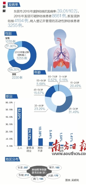 2016年,东莞共发现可疑肺结核患者8661例,其中新发现肺结核4194例,主要集中在25岁至34岁人群,而人口密度、劳动强度大的工人是结核病易感人群,占比超过了一半。今日是世界防治结核病日,记者从东莞市第六人民医院了解到,一些患者不够疗程就停药,形成耐药性肺结核,治疗难度和费用大大增加。