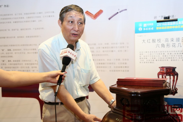 2016全国品牌红木家具经销商大会之“受市场欢迎的中山红木家具畅销精品评选”,鸿运堂携《大红酸枝·高束腰三弯腿六角形花几》艳惊四座,并迅速抓住了曹老师欣赏的眼球。