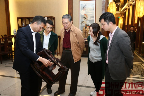 萧耀能总经理(右一)为曹静楼老师一行介绍鸿运堂家具的工艺及造型特点