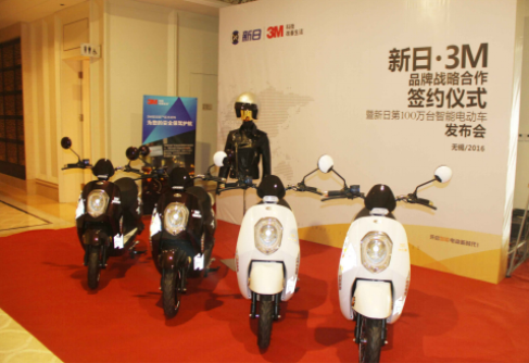 2016年12月16日,新日电动车联合3M公司发布了具有里程碑意义的第100万台智能电动车——新日晶致跨界合作纪念版。第100万台新日智能电动车的诞生证明了新日多年来坚持电动车智能化路线的正确性,证明了智能的力量正在改变着整个行业的生态与未来发展方向。