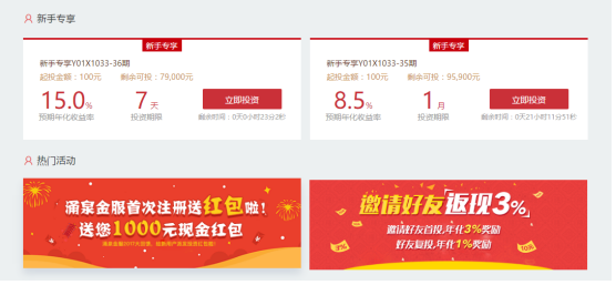 在首页栏,用户下拉即可看到涌泉金服正在进行的热门活动,让投资者把握住每一次的理财优惠时机。目前涌泉金服主推新手注册赠送1000元现金红包和邀请好友返现3%两个活动,让新老用户均能享受到互联网理财的红利。同时还有专为新手推荐的新手专享产品,包括收益达15%的7天短期理财。