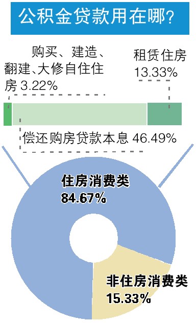 在提取金额中,住房消费提取占84.67%,非住房消费提取占15.33%。而在住房消费中,购买、建造、翻建、大修自住住房占3.22%,偿还购房贷款本息占46.49%,租赁住房占13.33%。