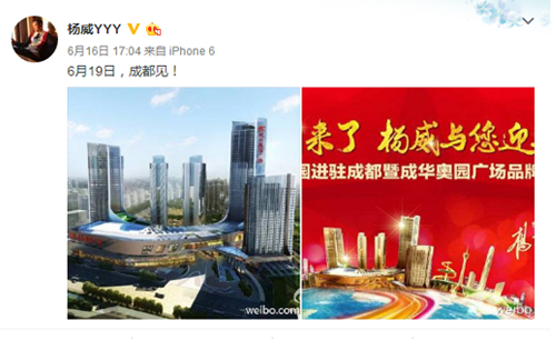 2016年6月19日,奥运冠军杨威在新浪微博上发布了一条:“6月19日成都见”的微博,迅速引起了粉丝关注和成都市民沸腾。中国奥园进驻成都揭开了神秘面纱。中国奥园地产集团成功收购取得原成都宜华置业大东展项目股权,进驻美丽的蓉城——成都,大东展项目全新升级为成华奥园广场。