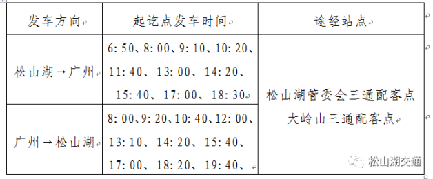 客运班线每天上午6时50分和8时分别从松山湖汽车客运站和广州天河客运站发出首班车,此后每隔70到90分钟发一班车。广州往松山湖方向每天最后一班车发车时间为19时40分,松山湖往广州方向每天最后一班车发车时间为18时30分。