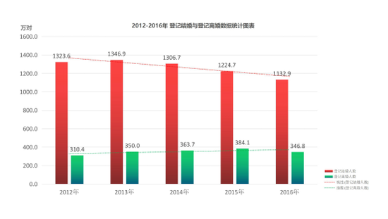 民政部今年2月公布的统计数据显示,2016年中国结婚登记共1132.9万对,离婚登记共346.8万对。而2015年这两个数据分别是1224.7万对和384.1万对。其中结婚登记人口已经连续四年出现下降趋势,离婚人口在过去五年里也出现了整体攀升的趋势。随着社会生活节奏变快,现代社会婚姻制度的开放,婚姻越来越像快消品,离婚也不再是大家嘴里讳莫如深的话题。随着离婚率逐年攀升,衍生出来的婚姻情感问题、子女抚养费、再婚成本等话题也成为了社会关注的焦点。