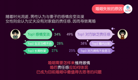 家家都有本难念的经。离婚原因非常复杂,不仅来自个人生活差异、主观感受,也牵涉到个人三观等诸多问题。据世纪佳缘调查报告显示:“对方缺乏责任感”、“婚内出轨”、‘感情边谈“呈离婚原因Top3,婚内出轨已经成为选择离婚的第二大因素。其中,有49%的离异女认为“对方缺乏责任感”是导致她们上一段婚姻结束的主要原因;34%的离异男则认为“感情不和”是导致她们上一段婚姻结束的主要原因。其中,“感情变淡”是导致双方婚姻结束的共同导火索。另有18%女性因“家庭暴力“而选择离婚。所以,婚姻需要如何来维持激情以及婚后的责任感究竟应当如何体现,这两点已成为目前婚姻中最值得我们去思考的问题。