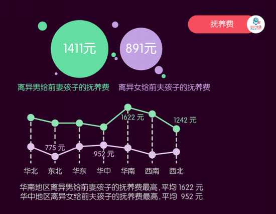 在孩子的抚养费问题上,华南地区离异男性给出的抚养费最高,平均每月1622元,西北离异男性给前妻孩子的抚养费最少,平均每月1242元。女性方面,华中地区的离异女性给前夫孩子的抚养费最多,平均每月952元,东北地区最少,平均每月775元。