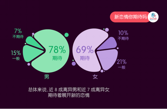 根据世纪佳缘此次发布的离婚调研报告显示,离异人群中,78%的男性和69%的女性都表示“期待开展一段新的恋情”。而随着年龄的增长,离异男性恋爱动力无显著变化,但离异女性的恋爱动力却显著上升。同样的,随着自身压力的增大,离异女性恋爱动力的上升幅度也高于男性。而对于支撑自己开展新恋情的原因,离异男性最大的动力是因为“从上一段婚姻中吸取了经验”,而离异女性的最大动力则是来源于“生理上、心理上都希望能有人陪伴”。