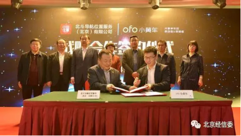 在发布会上,北京北斗导航与位置服务产业公共平台(以下简称北斗公共服务平台)与ofo小黄车签署了《北斗ofo小黄车战略合作协议》。