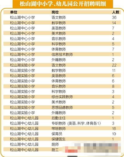 招聘明细:语文类14人、数学类6人、英语类4人、音乐类7人、美术类2人、体育类5人、科学类1人、信息技术类1人、心理卫生类3人。