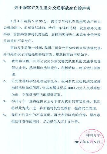 4月5日,神州专车就此事故对外发表的声明显示:神州愿意承担相应法律责任,积极赔偿,绝不做任何推诿。此外,神州专车还提出了尽力提供人道主义补偿。但与对方家属提出的要求未能达成一致。