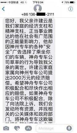 据媒体报道,在2月10日,双方正式见面谈赔偿事宜。家属提出除了常规保险赔付外,另加2000万赔偿的要求。之后,逝者次子许先生再次以短信告知赔偿要求。