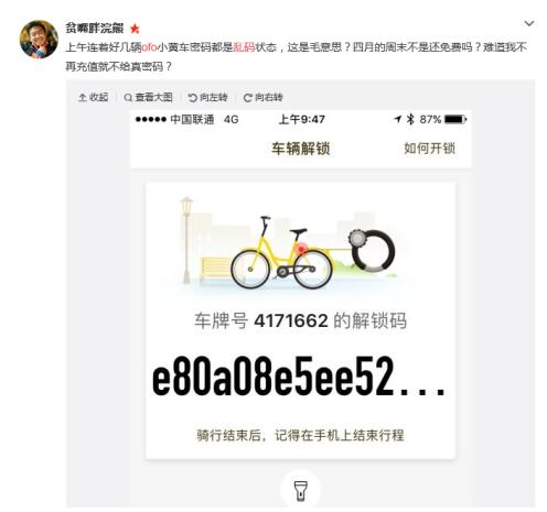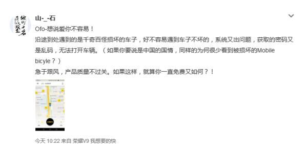 网友@山-_-石 则称:ofo想说爱你不容易,沿途到处遇到的是千奇百怪损坏的车子,好不容易遇到车子不坏的,系统又出问题,获取的密码又是乱码,无法打开车辆……给予跟风,质量不过关。如果这样,就算你一直免费又如何?