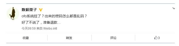 也有不少网友对此反应强烈,直接选择了退款。网友@数据栗子说,ofo系统挂了?出来的密码怎么都是乱码?好了不说了,准备退款。