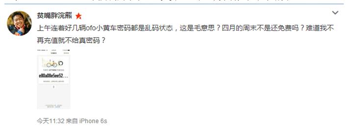 微博网友 "贫嘴胖浣熊 "今日上午11时32分反映:上午连着好几辆ofo小黄车密码都是乱码状态,这是毛意思?四月的周末不是还免费吗?难道我不再充值就不给真密码?
