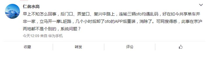 微博网友 "仁者水高"也遇到了同样的问题:早上不知怎么回事,后门口、弄堂口、复兴中路上,连输三辆ofo均遇乱码,好在如今共享单车并非一家,立马开一摩L赶路,几个小时后卸了ofo的APP后重装,消除了。可网搜得悉,此事在京沪两地都不是个别的,系统问题?