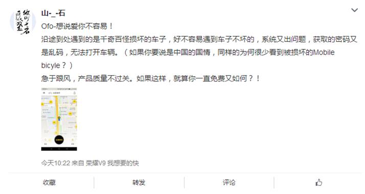 微博网友 "山-_-石" 对本次宕机事件非常不满:Ofo-想说爱你不容易!沿途到处遇到的是千奇百怪损坏的车子,好不容易遇到车子不坏的,系统又出问题,获取的密码又是乱码,无法打开车辆。(如果你要说是中国的国情,同样的为何很少看到被损坏的Mobile bicyle?