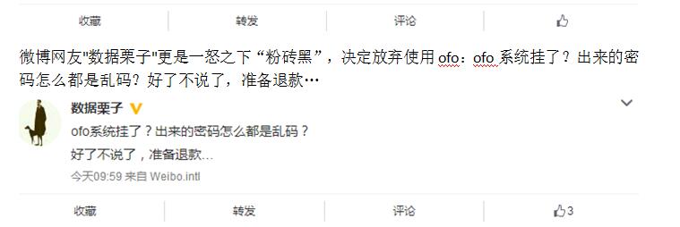 微博网友"数据栗子"更是一怒之下“粉砖黑”,决定放弃使用ofo:ofo系统挂了?出来的密码怎么都是乱码?好了不说了,准备退款…