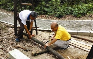 记者看到,老人们拿着铁丝、锯子等工具正在忙碌。而满身尘土、正在锯木头的老人,就是阿棠。他们几个正打算利用废旧木材,在这里搭一个简易凉亭,供游人在此歇脚。当天早上,他们特地找来一些废弃的木材和床板扛上了山。