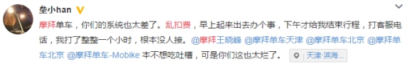 除了“系统异常”导致错算骑行时间外,锁车后系统不结束计费也时有发生。据记者了解,在清明小长假期间,摩拜单车出现大面积宕机,大量用户里程记录和充值记录被更改或清零。不少用户在微博反映,宕机事故发生后,不仅扫码解锁单车时app秒退,客服电话也无法拨通,更严重的是锁车后系统计费无法终止,以致有用户被误判骑行16小时。