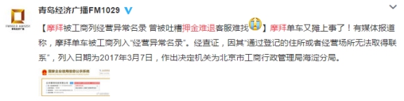 然而,实际情况并非如此。据记者了解,今年3月,工商局曾将北京摩拜科技有限公司列入“经营异常名录”,并且就摩拜押金难退、客服难找等问题对其点名处分,勒令摩拜“优先解决退款问题”,避免“由于退期延期引起社会恐慌”。