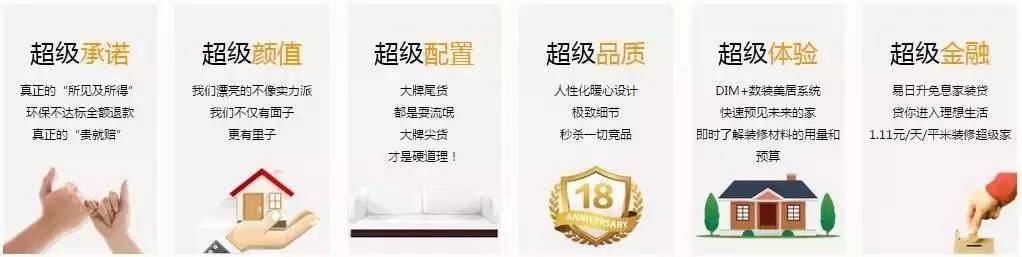 超级承诺、超级颜值、超级配置、超级品质、超级体验、超级金融六大超级为您护航,家装的本质是为了打造更舒适的生活。从品质生活出发,外在颜值,内在工艺、环保、收纳全面升级。