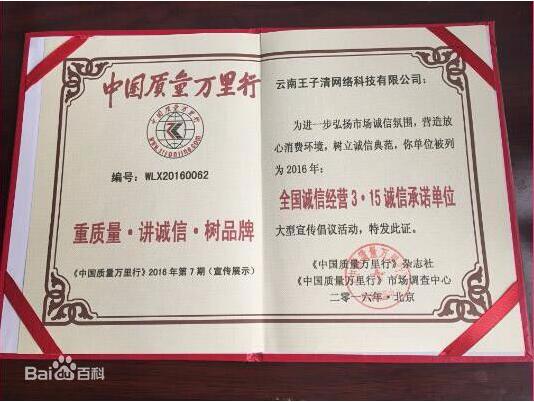 2016年7月(王子清网络科技有限公司)被中国质量万里行授予:|全国诚信经营3•15诚信承诺单位。
