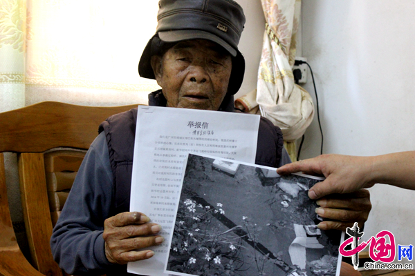 图为村民叶某手持举报信和水污染照片。