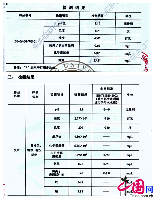 随后,记者分别从被污染的两处地方取得水样,分别送往深圳两个水质检测公司进行检测,除对部分项目无法做出判断外,两份报告显示,氨氮、PH值、色度、浊度、化学需氧量、五日生化需氧量、重金属铁和锰均有不同程度的超标。