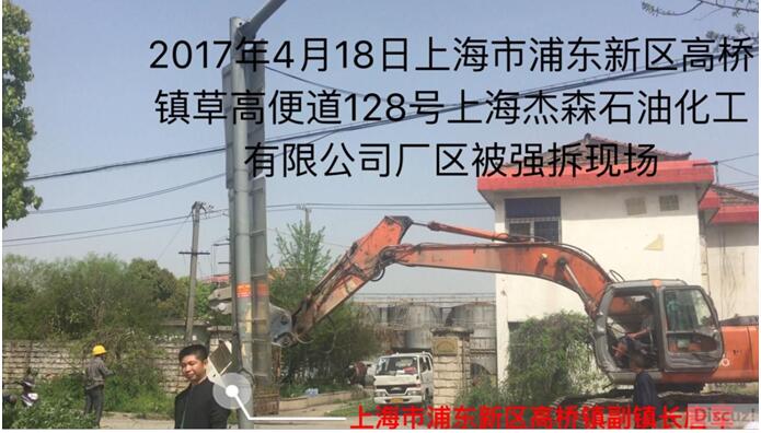 “明显的违法,没有任何法律文书、拆迁手续,也没有任何司法部门在场,厂子的销售部、财务部、会议室就瞬间被强拆了”“更让人不能接受的是上海市浦东新区高桥镇政府一再声称不会强拆,然而就在4月18日早上8点,该镇政府一唐姓副镇长带领三岔港村书记、村长等人,对杰森进行了强拆”上海杰森石油化工有限公司刘先生说,