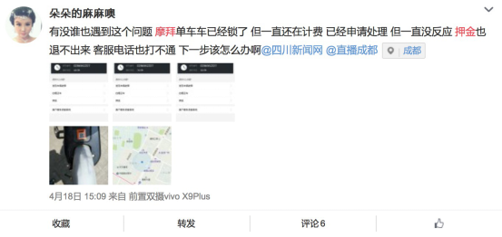 而摩拜承诺的押金“最长7天会到账”,据了解,网络上一片抱怨,诸多用户都表示逾期未返还。这或许只是冰山一角,在被曝出或挪用押金扩展市场的消息后,摩拜押金问题渐渐浮出水面。