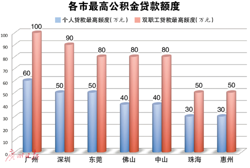 在上述7市中,职工贷款额度最高的是广州,个人最高贷款额度为60万元,双职工最高贷款额度为100万元;其次是深圳,个人最高贷款额度是50万元,双职工是90万元;东莞第三,个人最高贷款额度为50万元,双职工为80万元,高于佛山、中山和珠海。