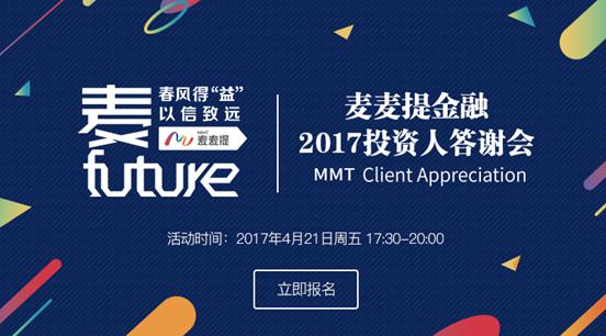 2016年,因为有你,麦麦提金融添羽添翼,茁壮成长。为感谢广大投资人对麦麦提金融一路的支持及喜爱,麦麦提将于4月21日在上海浦东香格里拉大酒店举办“麦Future—春风得益 以信致远”麦麦提金融2017投资人答谢会。